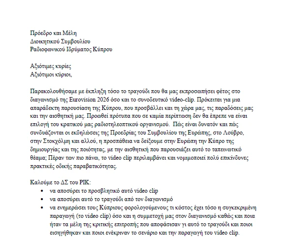 Με αφορμή τις αντιδράσεις, διάφορες προσωπικότητες απέστειλαν επιστολή προς το Ραδιοφωνικό Ίδρυμα Κύπρου (ΡΙΚ) ζητώντας την απόσυρση του video clip και του τραγουδιού από τον διαγωνισμό. Στην επιστολή αναφέρεται: