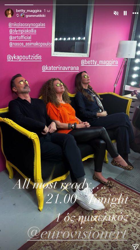 Οι τρεις παρουσιαστές, λίγη ώρα πριν την έναρξη του διαγωνισμού απόλαυσαν στιγμές χαλάρωσης ενώ δεν παρέλειψαν να βάλουν φέτες αγγουριού στα μάτια τους προκειμένου να δώσουν λάμψη στο πρόσωπό τους εν όψει της απαιτητικής βραδιάς.