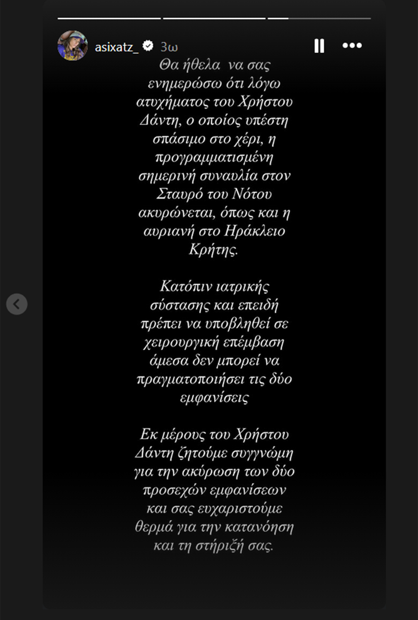 Εκ μέρους του Χρήστου Δάντη ζητούμε συγγνώμη για την ακύρωση των δύο προσεχών εμφανίσεων και σας ευχαριστούμε θερμά για την κατανόηση και τη στήριξή σας», έγραψε η Ασημίνα Χατζηανδρέου για το ατύχημα του Χρήστου Δάντη».