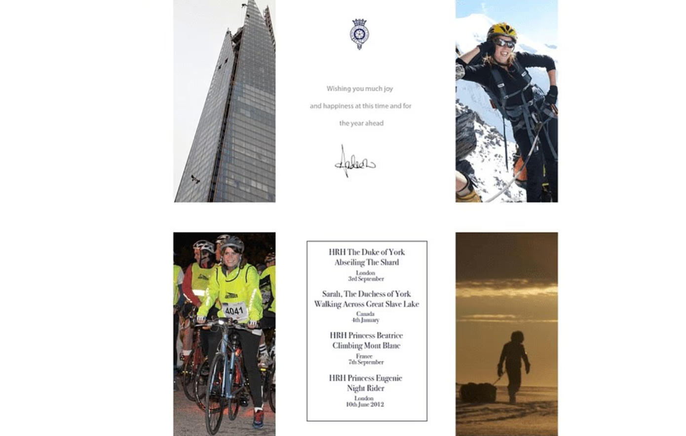 Ωστόσο, σύμφωνα με τα λεγόμενα αρχεία Έπσταϊν , η κάρτα περιείχε τρεις φωτογραφίες των θυγατέρων του, της Βεατρίκης και της Ευγενίας – δύο μαζί του και μία κοινή τους. Οι εικόνες τραβήχτηκαν όταν οι δύο πριγκίπισσες ήταν 23 και 21 ετών αντίστοιχα. Στην κάρτα υπήρχε και σκίτσο που απεικόνιζε έναν άνδρα να περπατά στο χιόνι με σκυλιά, κατευθυνόμενος προς χιονάνθρωπο που κρατά τη βρετανική βασιλική σημαία.