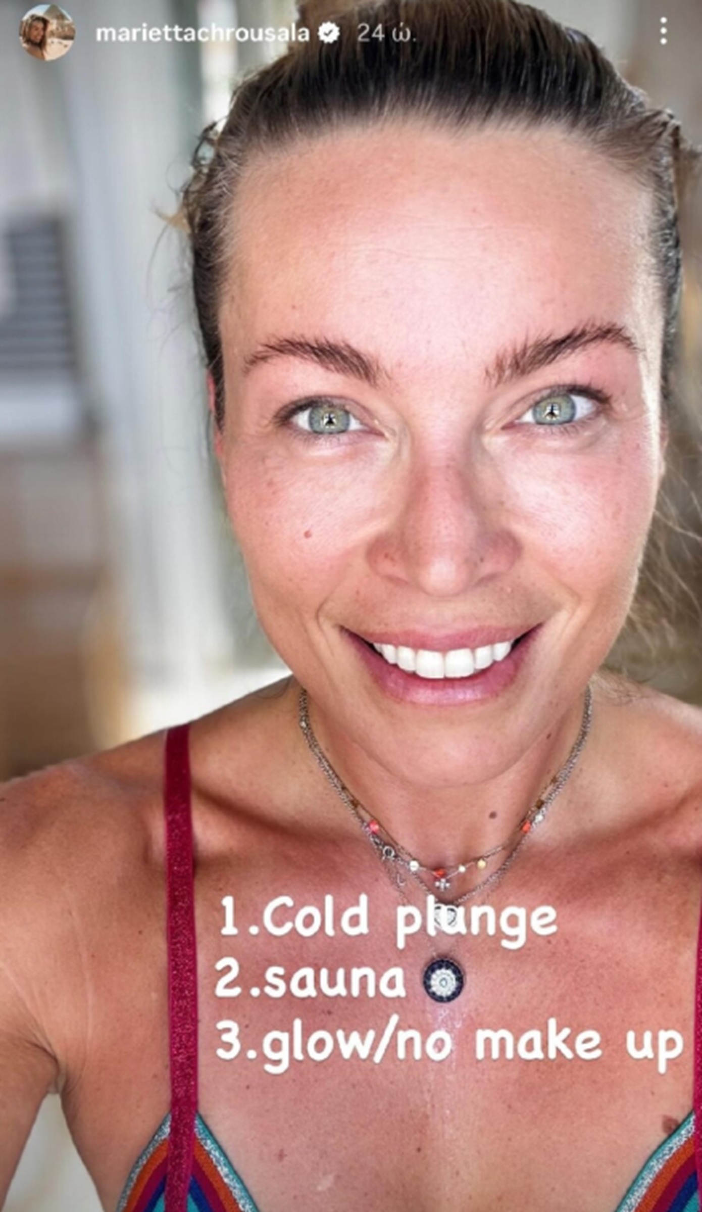 Οι followers της που παρακολουθούν τι ανεβάζει κατά καιρούς, μάλλον δεν παραξενεύτηκαν. Εδώ και καιρό η Μαριέττα Χρουσαλά ακολουθεί αυτή την πρακτική, δηλαδή να βουτά για λίγα λεπτά σε παγωμένο νερό ως μέρος του beauty routine της, προκειμένου να διατηρεί σφριγηλό το δέρμα της.
