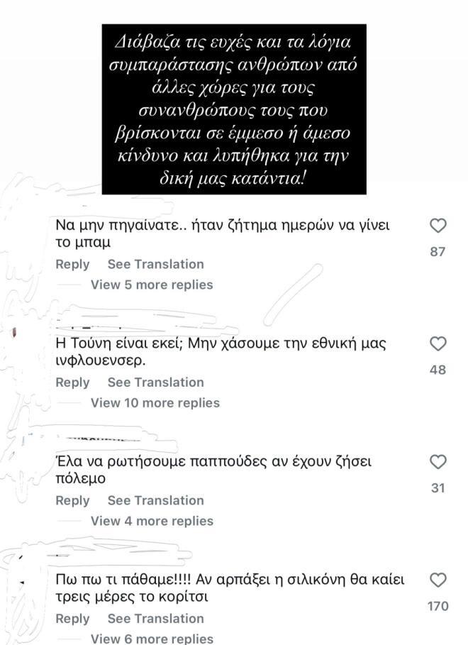 Όπως χαρακτηριστικά έγραψε στο κείμενό της: «Ναι μπορεί πολλοί να μην ασχολήθηκαν με την Γενοκτονία στην Γάζα. Ναι μπορεί να βρίσκονται “στον κόσμο τους” μέχρι που τους χτύπησε την πόρτα “το πρόβλημα”. Όμως άλλο να διαφωνούμε με τον τρόπο που αντιμετωπίζουν τον κόσμο κάποιοι συνάνθρωποί μας και άλλο να τους κοροϊδεύουμε σε μία δύσκολη στιγμή ή να τους ευχόμαστε πράγματα που δεν θα ευχόμασταν στον χειρότερό μας εχθρό».