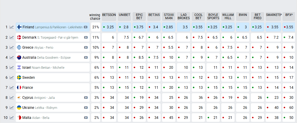 Στην αντίπερα όχθη, η Φινλανδία δείχνει να παίζει χωρίς αντίπαλο στην παρούσα φάση. Με το κομμάτι «Liekinheitin» να έχει κερδίσει τις εντυπώσεις μετά την πρόσφατη επιλογή του, η χώρα απολαμβάνει την πρώτη θέση με ποσοστό 21% και αποδόσεις που ξεκινούν από 2,8.