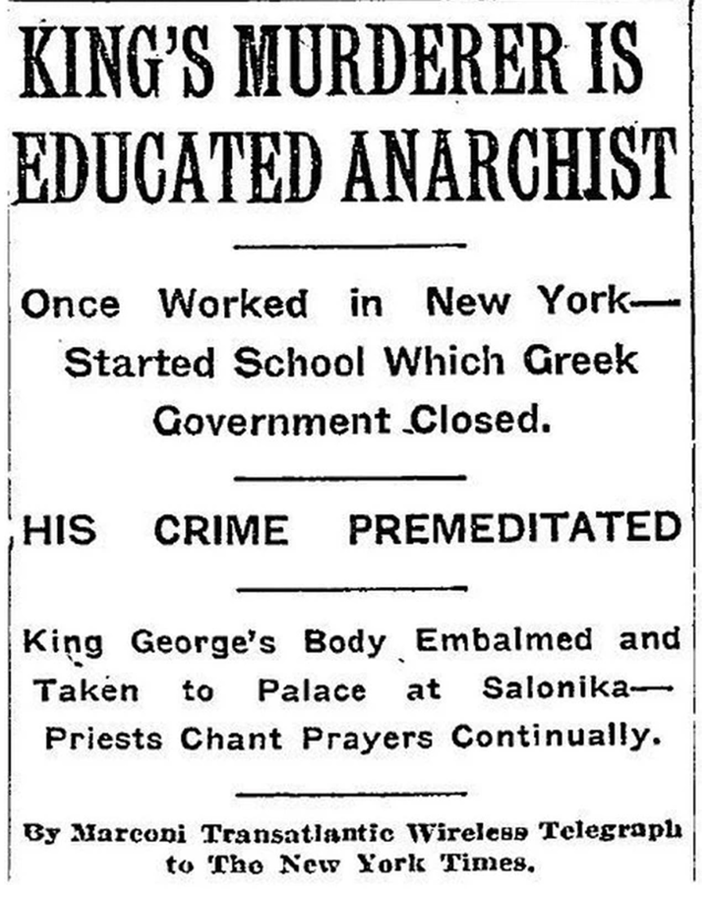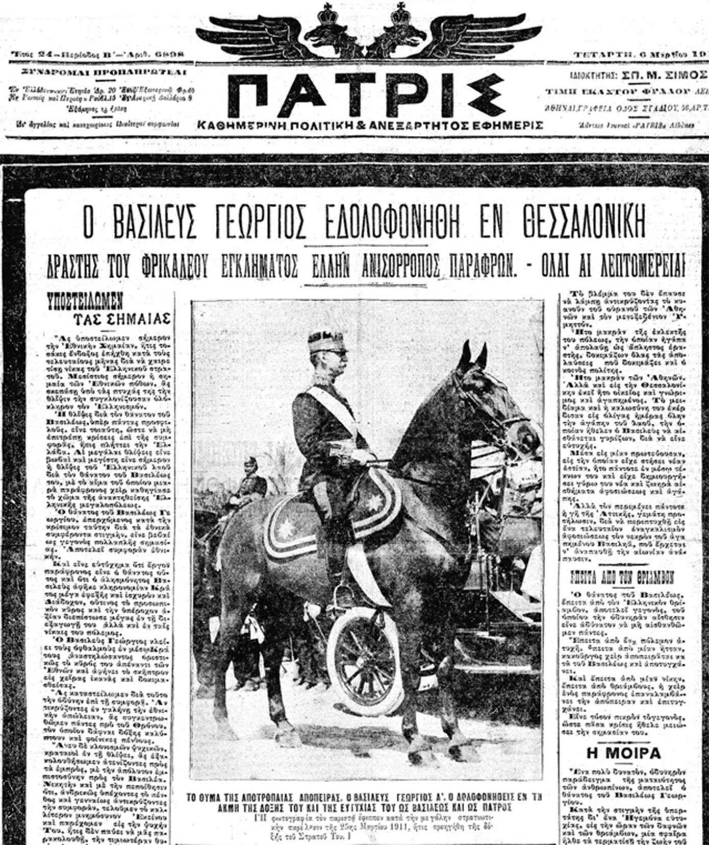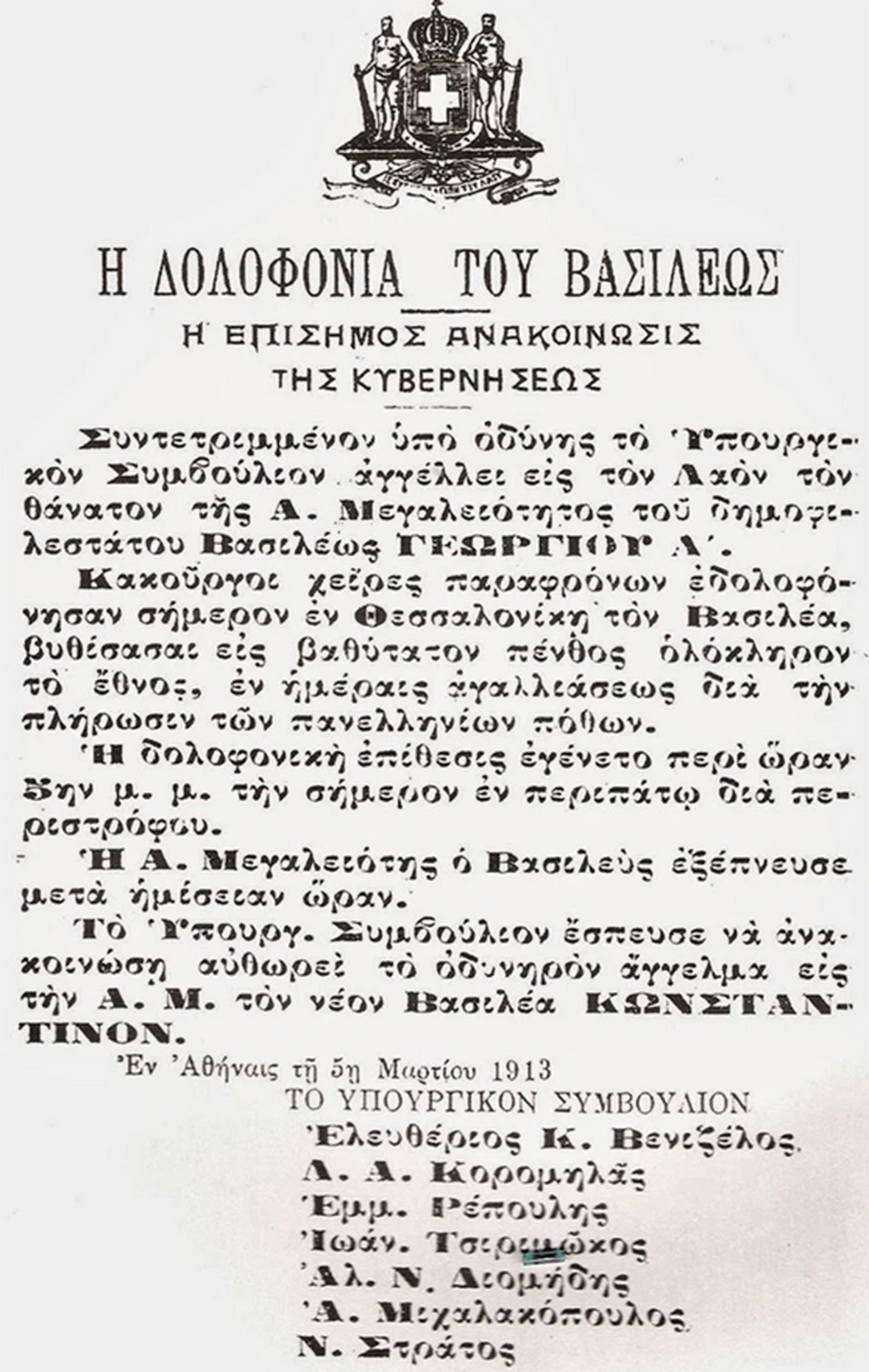 Ο Βασιλιάς Γεώργιος Α’, ο άνθρωπος που για μισό αιώνα ισορροπούσε ανάμεσα στις συμπληγάδες της εσωτερικής πολιτικής και των διεθνών πιέσεων, έπεσε νεκρός από τα πυρά ενός «μοναχικού» δράστη, αφήνοντας πίσω του ένα κενό εξουσίας σε μια κρίσιμη στιγμή των Βαλκανικών Πολέμων.