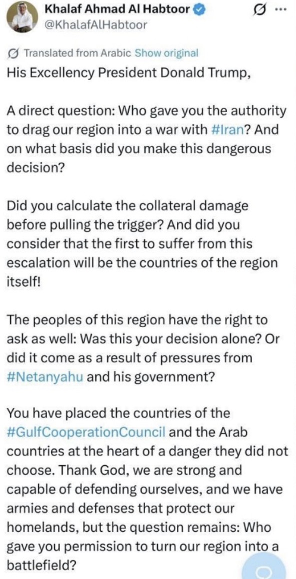 Στην επιστολή του ο Khalaf Ahmad Al Habtoor που θεωρείται εξέχων και ιδιαίτερα σεβαστός πολίτης των Ηνωμένων Αραβικών Εμιράτων, καθώς είναι αυτοδημιούργητος επιχειρηματίας, με έναν από τους πιο επιτυχημένους Ομίλους στον Κόλπο, ερωτά απευθείας τον Αμερικανό Πρόεδρο αν η απόφαση του για πόλεμο ήρθε από μόνη της ή προήλθε ως αποτέλεσμα πιέσεων από τον Νετανιάχου και την κυβέρνησή του, ενώ κλείνοντας την επιστολή του σηκώνει τους τόνους, ρωτώντας τον, εξ ονόματος των πολιτών του Κόλπου «ποιος σας έδωσε την άδεια να μετατρέψετε την περιοχή μας σε πεδίο μάχης;»