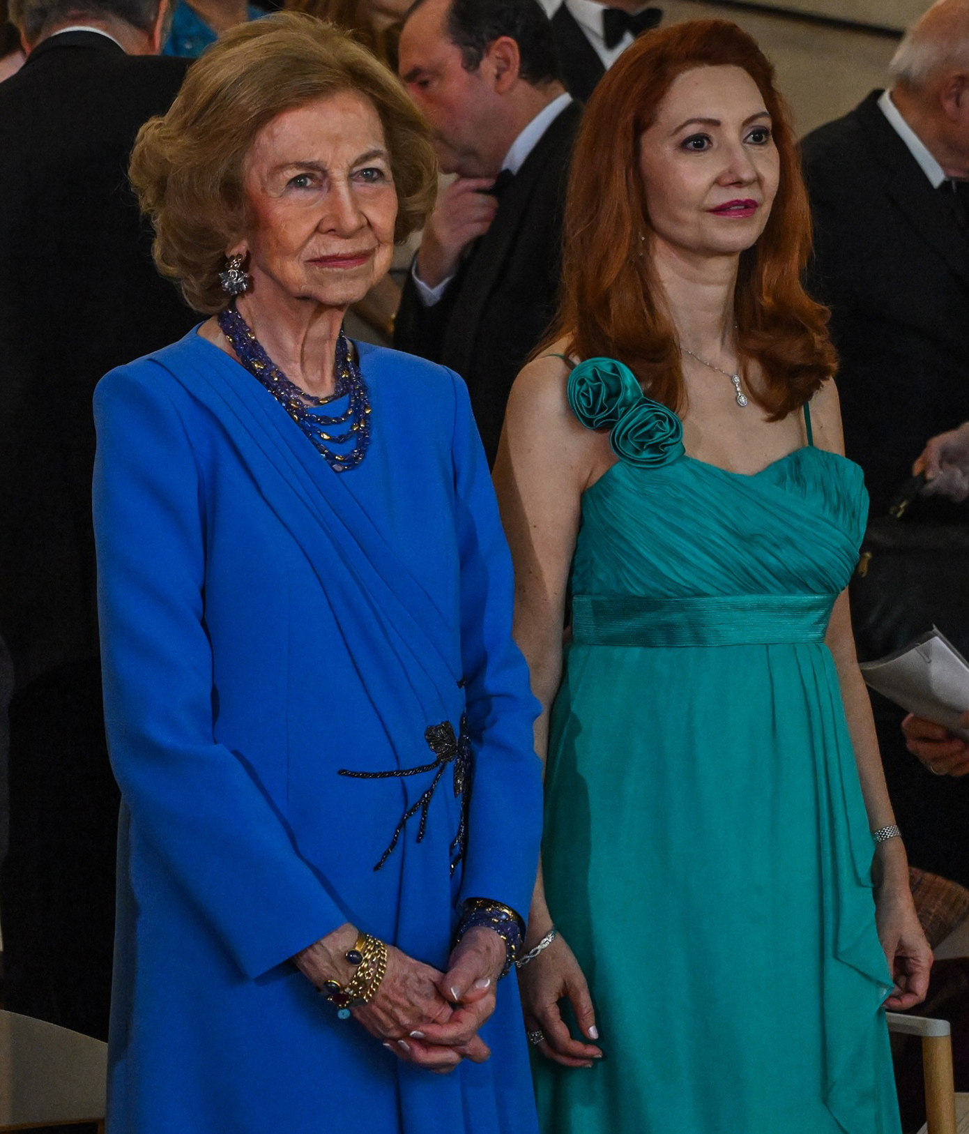 Στην εκδήλωση «America&Spain250», η βασίλισσα Σοφία της Ισπανίας επέλεξε ένα κομψό σατέν σύνολο σε έντονο μπλε, συνδυάζοντας σακάκι και μπλούζα με μαύρο παντελόνι και γόβες. Ωστόσο, παρά την αλλαγή στην εμφάνισή της, η βασίλισσα διατήρησε έναν διακριτικό συμβολισμό πένθους, επιλέγοντας μαργαριτάρια, ένα κόσμημα που συνδέεται ιστορικά με το βασιλικό πένθος.
