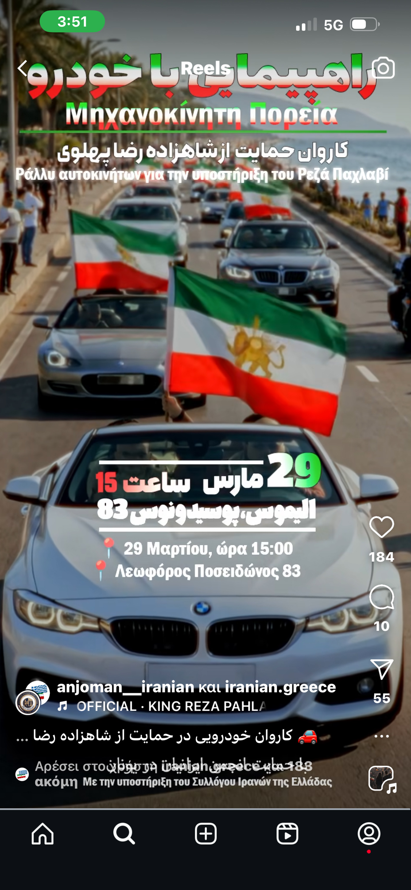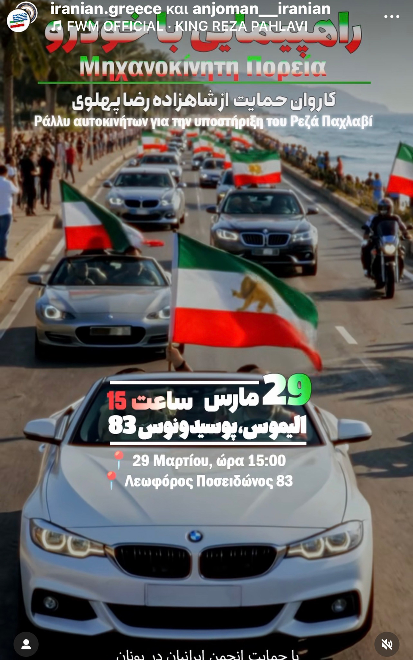 Μόλις χθες έγινε γνωστό, μέσω σελίδας κοινωνικής δικτύωσης που διατηρούν Ιρανοί πολίτες στην χώρα μας πως θα πραγματοποιηθεί μηχανοκίνητη πορεία στις 29 Μαρτίου και ώρα 3 το μεσημέρι που σκοπό έχει να υποστηρίξει τον διάδοχο του θρόνου του πρώην Αυτοκρατορικού Κράτους του Ιράν και επικεφαλή του Οίκου των Παχλαβί, Ρέζα Παχλαβί.