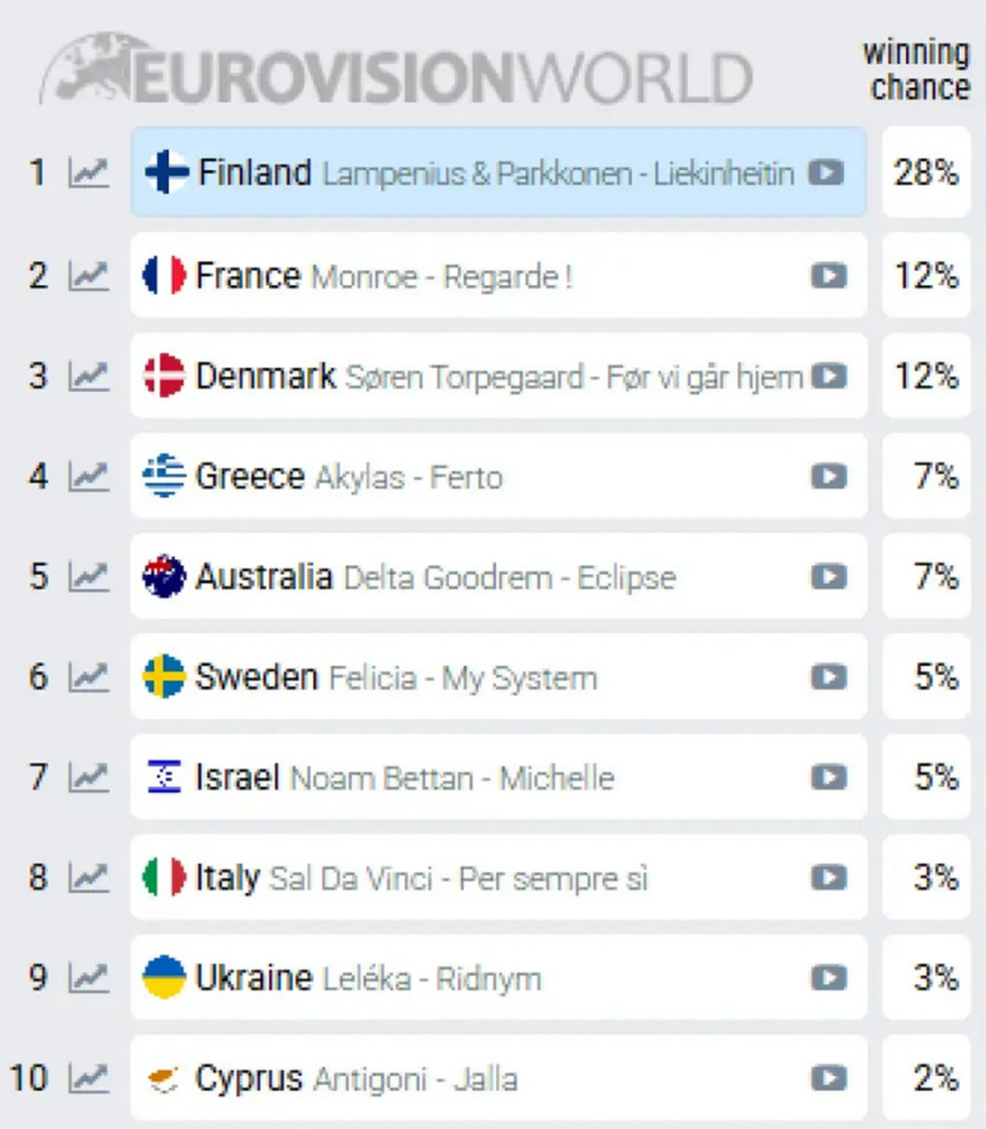 Στην κορυφή των προβλέψεων βρίσκεται η Φινλανδία, με σημαντική διαφορά και ποσοστό νίκης που φτάνει το 28%. Ακολουθούν Γαλλία με 12%, Δανία επίσης με 12% και από πίσω έρχεται Ελλάδα και Αυστραλία.