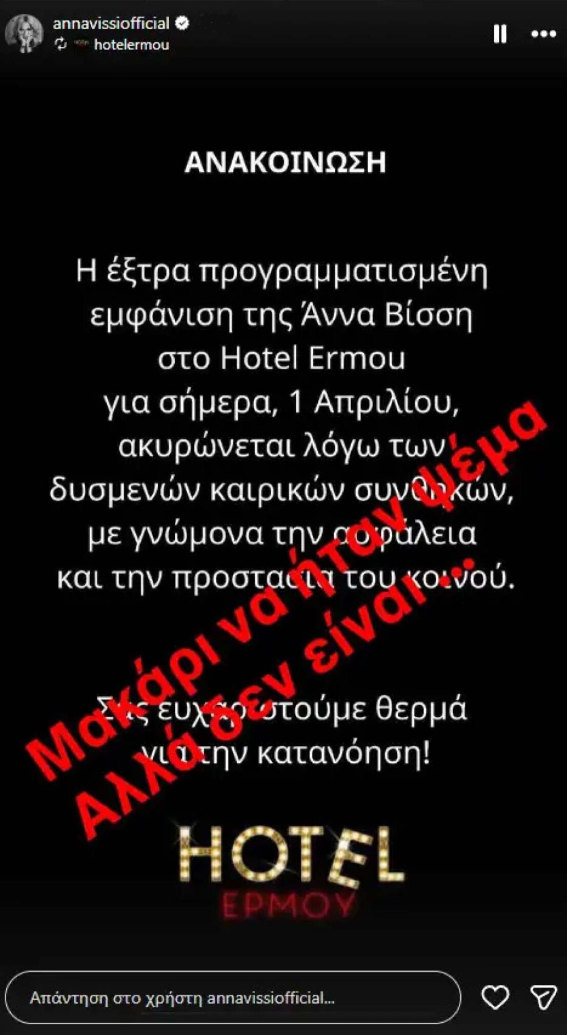 Μέσα σε αυτό το πλαίσιο, η προγραμματισμένη για απόψε, 1η Απριλίου, έξτρα εμφάνιση της Άννας Βίσση στο Hotel Ερμού δεν θα πραγματοποιηθεί. Η διεύθυνση του χώρου εξέδωσε ανακοίνωση εξηγώντας ότι η ακύρωση οφείλεται στις δυσμενείς καιρικές συνθήκες, με στόχο την προστασία των θαμώνων που θα ταξίδευαν για να παρακολουθήσουν το πρόγραμμα.