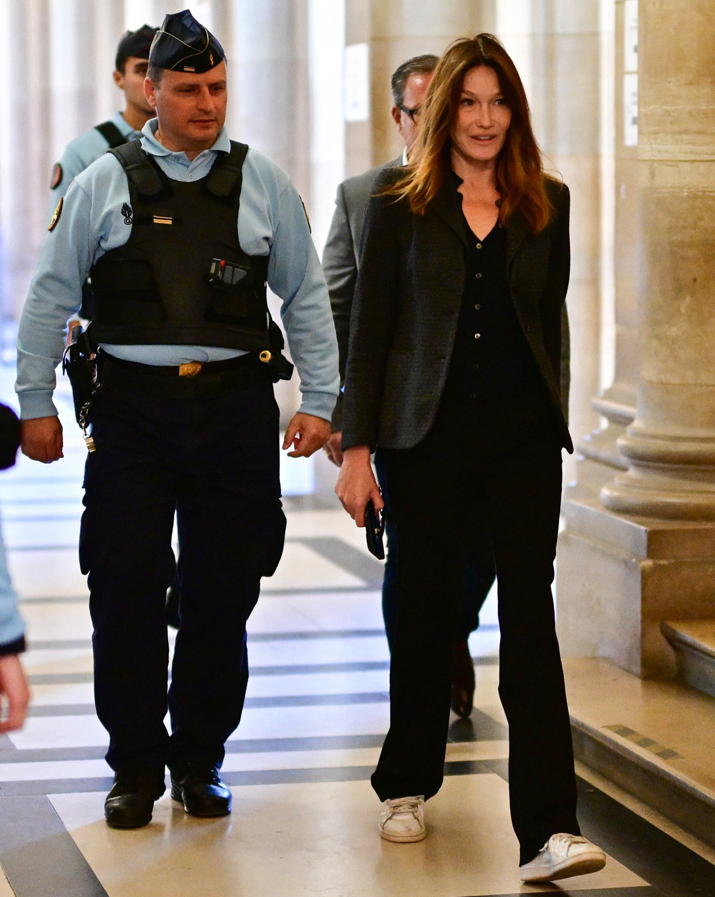 Η 58χρονη Κάρλα Μπρούνι εμφανίστηκε στο δικαστήριο για να στηρίξει τον σύζυγό της, συνοδευόμενη από δύο άνδρες ασφαλείας, κρατώντας μόνο τα γυαλιά ηλίου και το κινητό της τηλέφωνο.