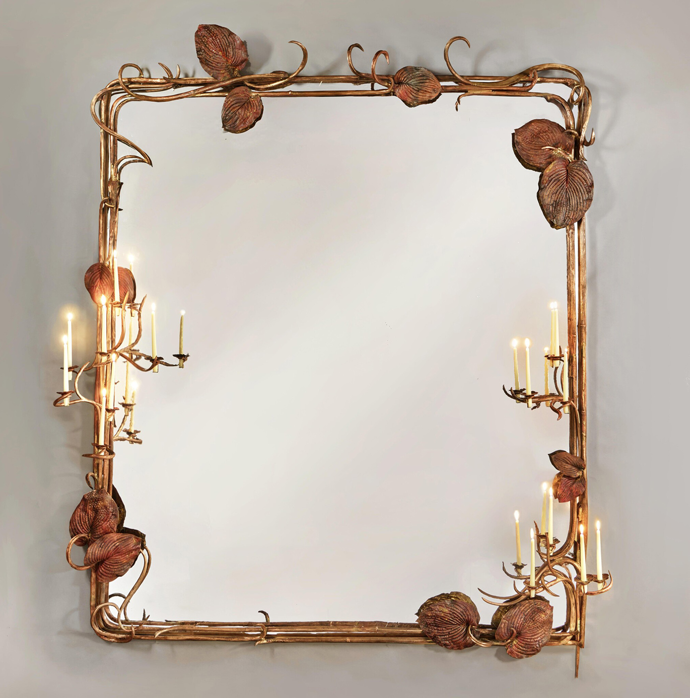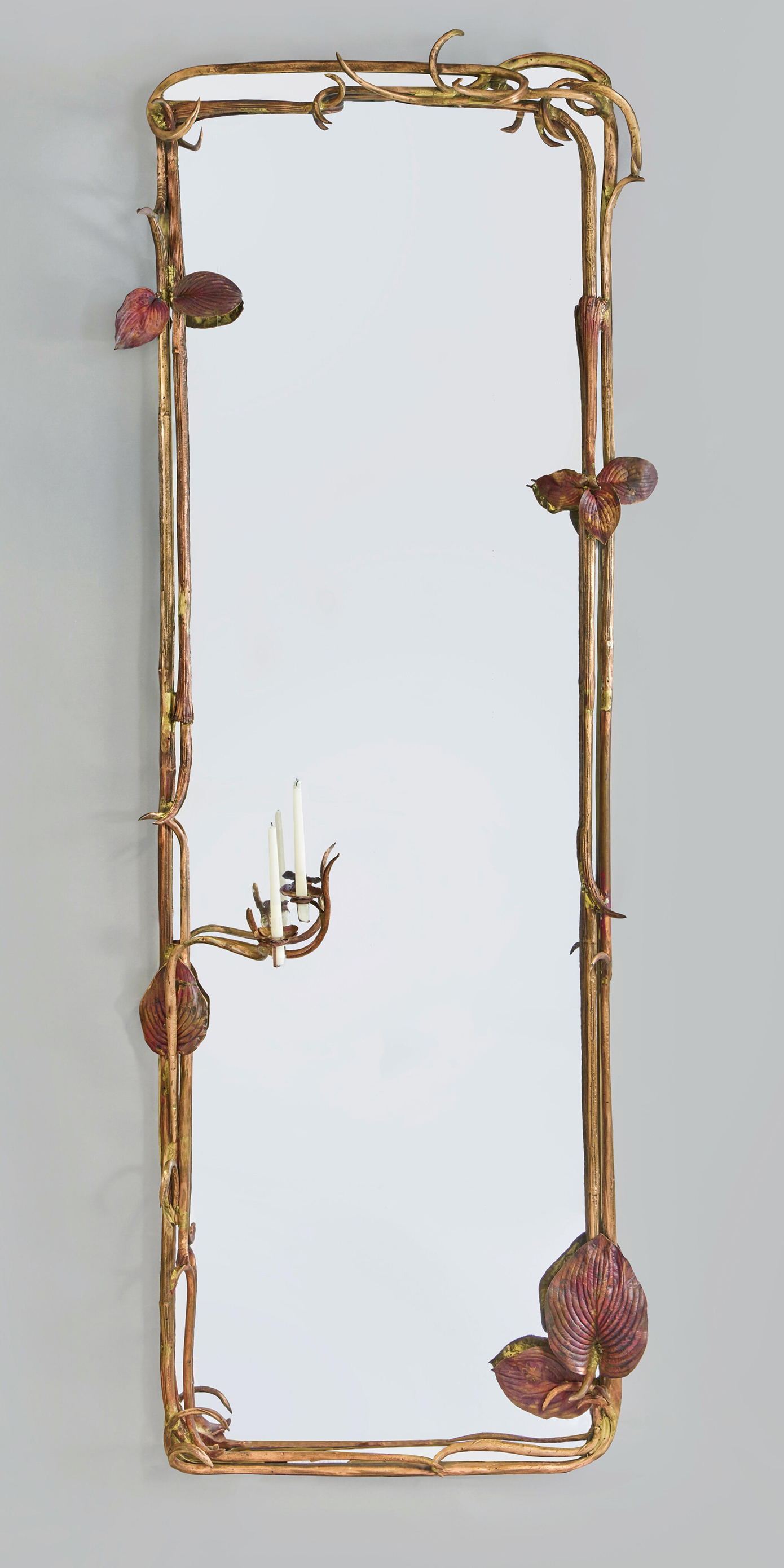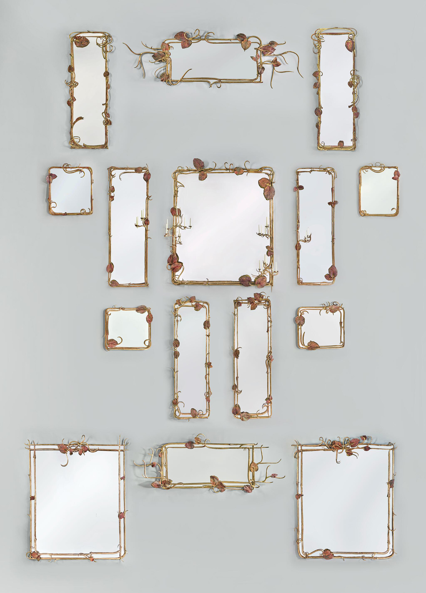 Ενώ το κάθε πλαίσιο καθρέπτη, από τους 15 συνολικά, «ζωντανεύει» από ελικοειδείς έλικες και διακόπτεται με μεγάλα φύλλα όστιας. Στη διαδικασία δηλαδή που ακολούθησε η Κλοντ Λαλάν τα φύλλα και τα λουλούδια που συλλέχθηκαν από τον κήπο της τοποθετήθηκαν σε γαλβανικά λουτρά που διατήρησαν τις φλέβες και τα περιγράμματά τους στο μέταλλο.