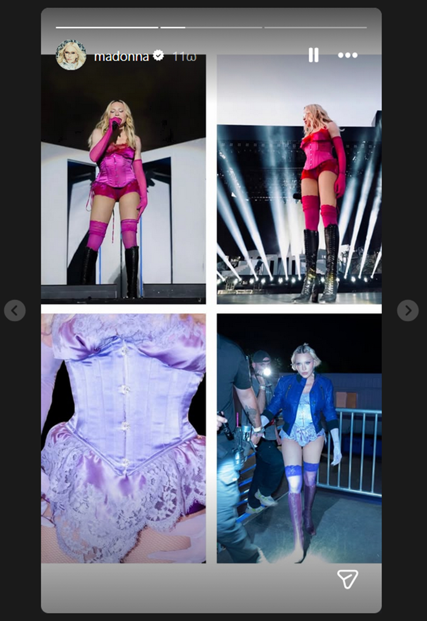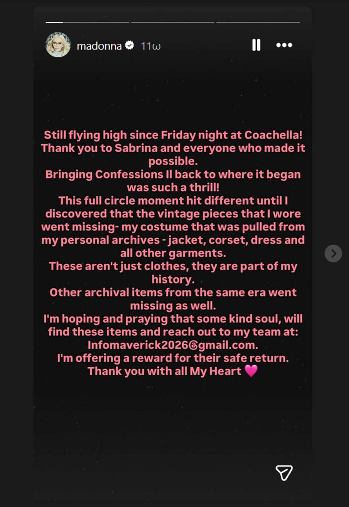 «Πετάω ακόμα ψηλά από την Παρασκευή το βράδυ στο Coachella! Ευχαριστώ τη Sabrina και όλους όσους το έκαναν δυνατό. Το να επαναφέρω το «Confessions II» εκεί που ξεκίνησε ήταν τόσο συναρπαστικό. Αυτή η στιγμή ήταν ξεχωριστή μέχρι που ανακάλυψα ότι τα vintage κομμάτια που φορούσα είχαν χαθεί, η στολή μου που ανέσυρα από το προσωπικό μου αρχείο, το σακάκι, ο κορσές, το φόρεμα και όλα τα άλλα ρούχα. Αυτά δεν είναι απλώς ρούχα, είναι μέρος της ιστορίας μου. Άλλα αρχειακά αντικείμενα από την ίδια εποχή χάθηκαν επίσης. Ελπίζω και προσεύχομαι ότι κάποια καλή ψυχή θα βρει αυτά τα αντικείμενα και θα επικοινωνήσει με την ομάδα μου. Προσφέρω μια ανταμοιβή για την ασφαλή επιστροφή τους. Σας ευχαριστώ με όλη μου την καρδιά», έγραψε η Μαντόνα στο Instagram.