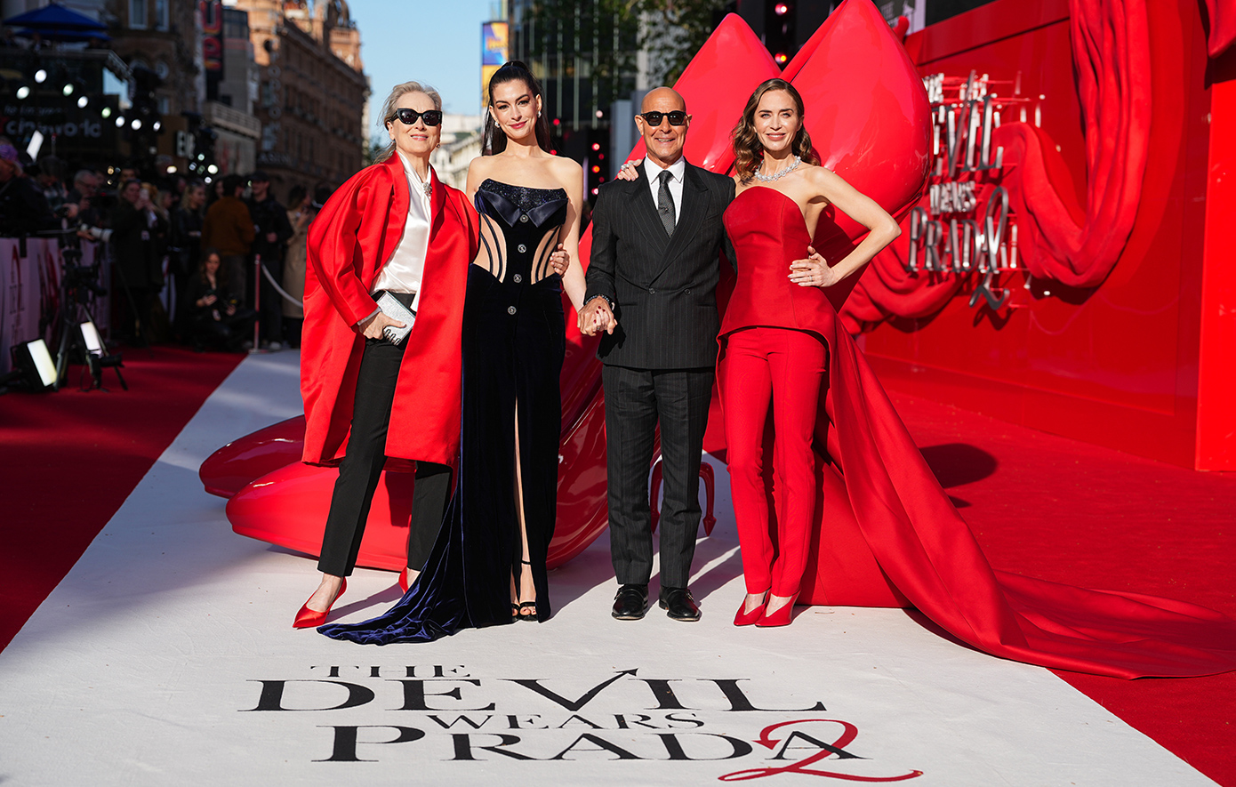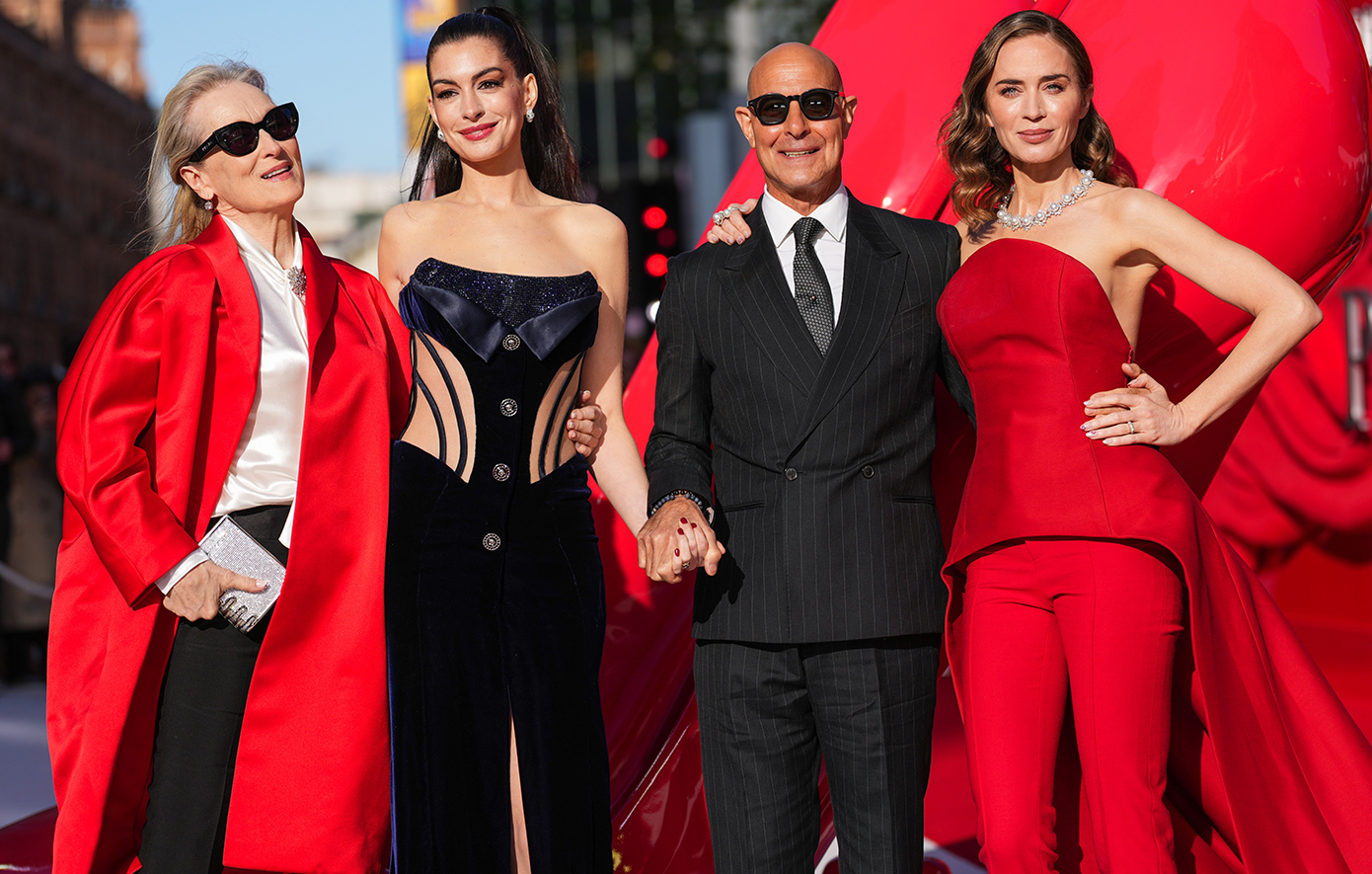 Οι πρωταγωνιστές της ταινίας Άν Χάθαγουεϊ, Μέριλ Στριπ, Έμιλι Μπλαντ και Στάνλεϊ Τούτσι έκλεψαν τις εντυπώσεις στο Λονδίνο, όπου το κόκκινο χρώμα κυριαρχούσε.