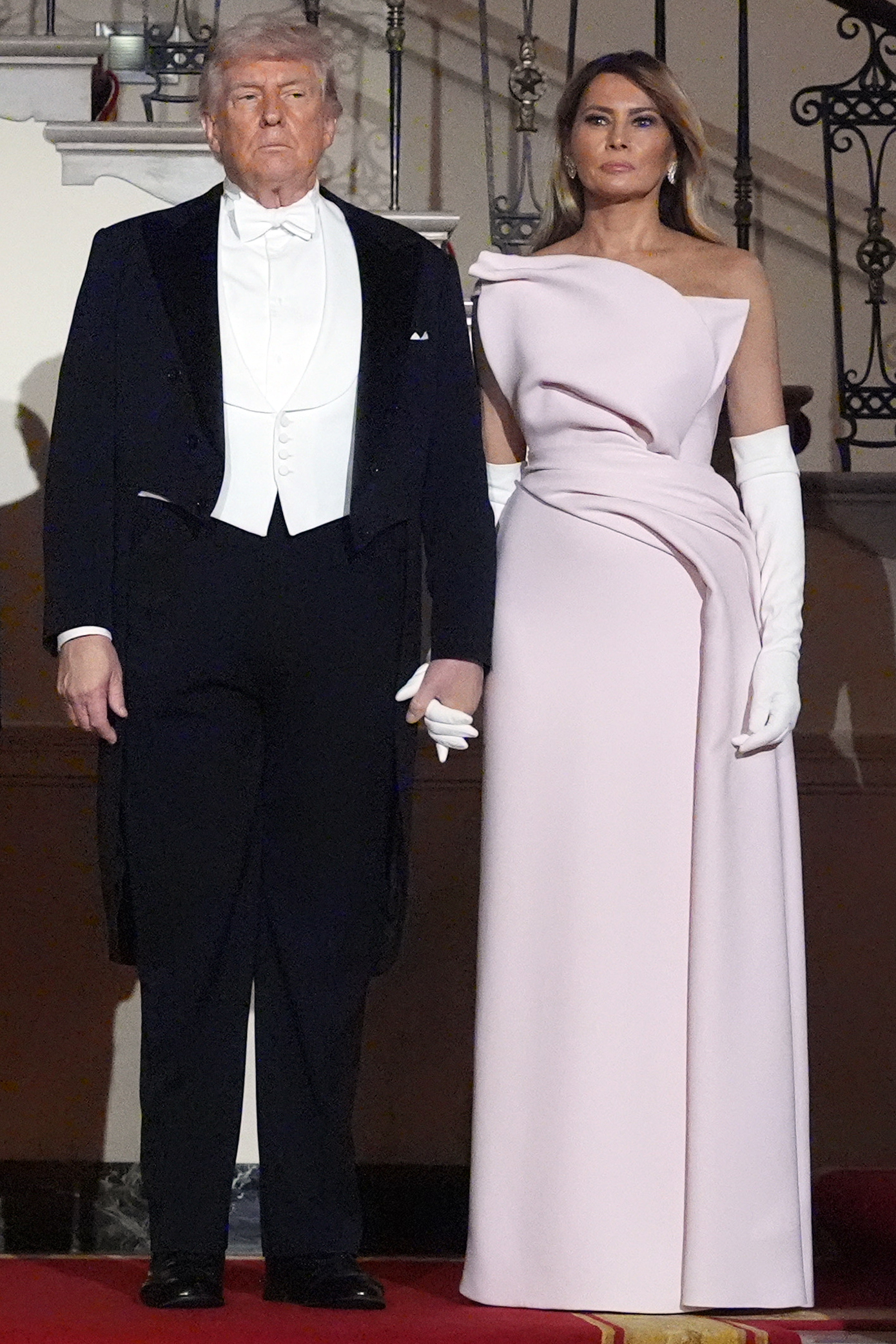 Η 56χρονη πρώτη κυρία φόρεσε ένα στράπλες φόρεμα από απαλό ροζ μετάξι του οίκου Christian Dior Haute Couture, συνδυασμένο με λευκά σουέντ γάντια και μεταξωτές γόβες. Ήταν χαμογελαστή καθώς περπατούσε δίπλα στον σύζυγό της, Ντόναλντ Τραμπ, ο οποίος φορούσε ένα κλασικό μαύρο σμόκιν, μαζί με τα μέλη της βασιλικής οικογένειας, όπως αναφέρει η New York Post.