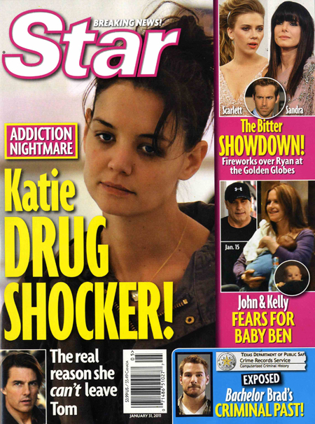 Ο τίτλος και οι υπότιτλοι «Εφιάλτης εθισμού- Η Katie σοκάρει με τον εθισμό στα ναρκωτικά- Ο πραγματικός λόγος που δεν αφήνει τον Τom Cruise» στο εξώφυλλο του περιοδικού «Star», ήταν αρκετά για να εξοργίσουν την Katie Holms. Το περιοδικό άφηνε υπονοούμενα ότι η ηθοποιός είναι εθισμένη στα ναρκωτικά και εκείνη έδωσε την απάντησή της μηνύοντας τους για πενήντα εκατομμύρια δολάρια.