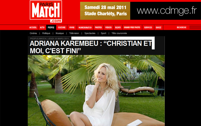 Αν και, όταν η Αντριάνα Σκλεναρίκοβα επισκέφτηκε την Ελλάδα, αρνήθηκε τις φήμες ότι είναι ένα βήμα πριν το χωρισμό με τον Κριστιάν Καρεμπέ, τελικά οι φήμες επιβεβαιώθηκαν. Σε συνέντευξή της στο γαλλικό «Paris Match» το μοντέλο εξηγεί τους λόγους που οδηγήθηκαν τα πράγματα στο διαζύγιο.