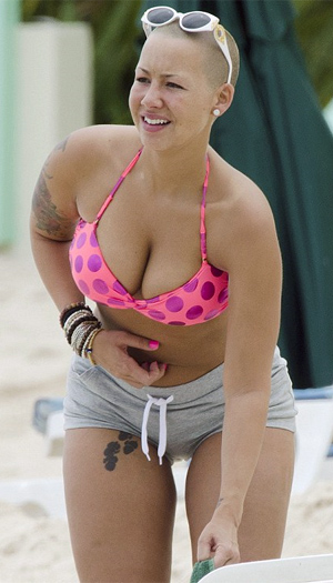 Το ξυρισμένο της κεφάλι και μόνο είναι αρκετό για να τραβήξει την προσοχή. Οπότε αν στο σκηνικό προσθέσετε και ένα φατναχτερό ροζ, πουά μπικίνι φανταστείτε τι έγινε στην παραλία των Μπαρμπέιντος που πλατσούριζε το Σαββατοκύριακο η Amber Rose!