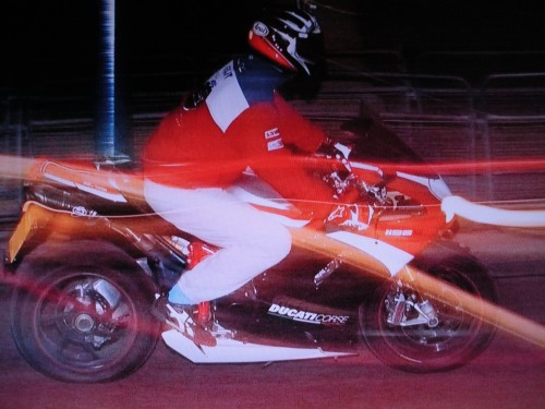 Φοράει αθλητικά παπούτσια και φόρμα και ένα αδιάβροχο με την βρετανική σημαία στο μανίκι και οδηγεί μία Ducati 1.100 κυβικών.