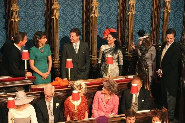(Από αριστερά) Ο πρωθυπουργός David Cameron, η σύζυγός του Samantha Cameron, ο αναπληρωτής πρωθυπουργός Nick Clegg, η σύζυγός του Miriam Gonzalez Durantez, η Frances Osborne και ο καγκελάριος του Exchequer George Osborne.