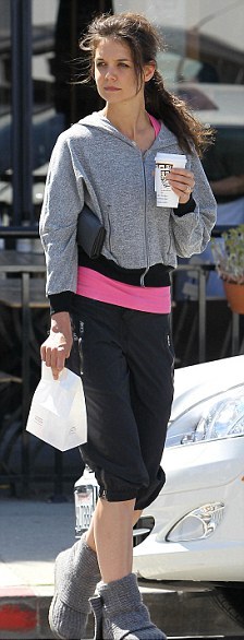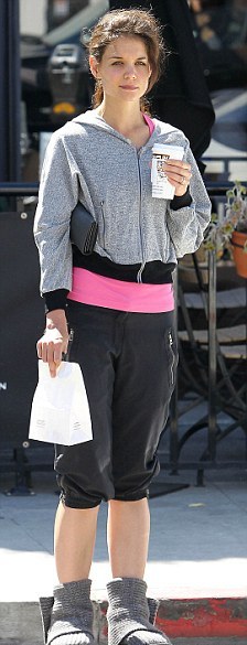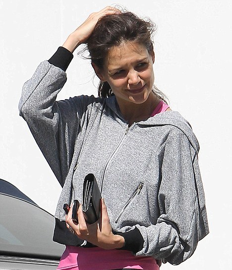 Ατημέλητη φορώντας ένα κοντό μαύρο παντελόνι, γκρι αθλητικό φούτερ και γκρίζες μπότες, εθεάθη η Κέιτι Χολμς.