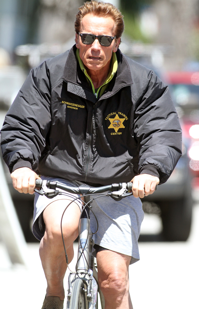 Μπροστά ο ποδηλάτης, πίσω- μέσα σε ένα SUV- ο «συναθλητής» και σωματοφύλακάς του. Φορώντας ένα μπουφάν που έγραφε «Κυβερνήτης Σβαρτζενέικερ» ο Άρνι βγήκε για προπόνηση στη Σάντα Μόνικα της Καλιφόρνια.