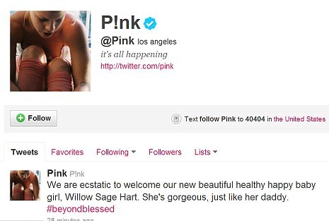 «Είμαστε εκστασιασμένοι και καλωσορίζουμε το πανέμορφο, υγιές ευτυχισμένο κοριτσάκι μας, την Willow Sage Hart. Είναι υπέροχη σαν τον πατέρα της», έγραψε στο λογαριασμό της στο twitter η Pink πληροφορώντας έτσι τον κόσμο ότι έγινε μητέρα.