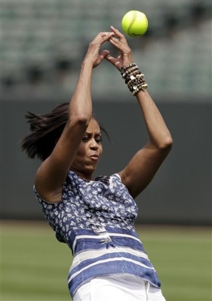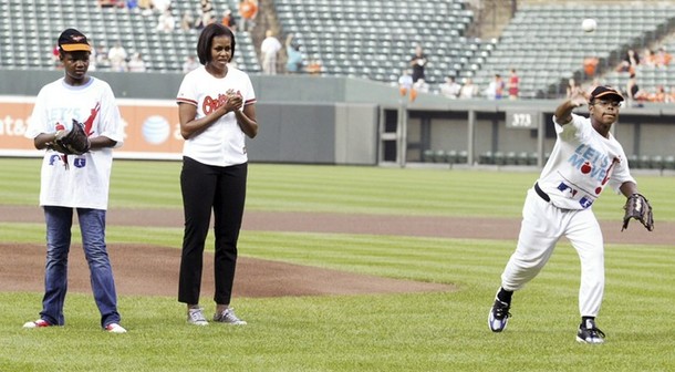 Η Μισέλ Ομπάμα βρέθηκε στο γήπεδο της Βαλτιμόρης και έπαιξε μπέιζμπολ με τα παιδιά του νοσοκομείου της περιοχής και το βράδυ στον επίσημο αγώνα έριξε την πρώτη βολή για την έναρξη.
