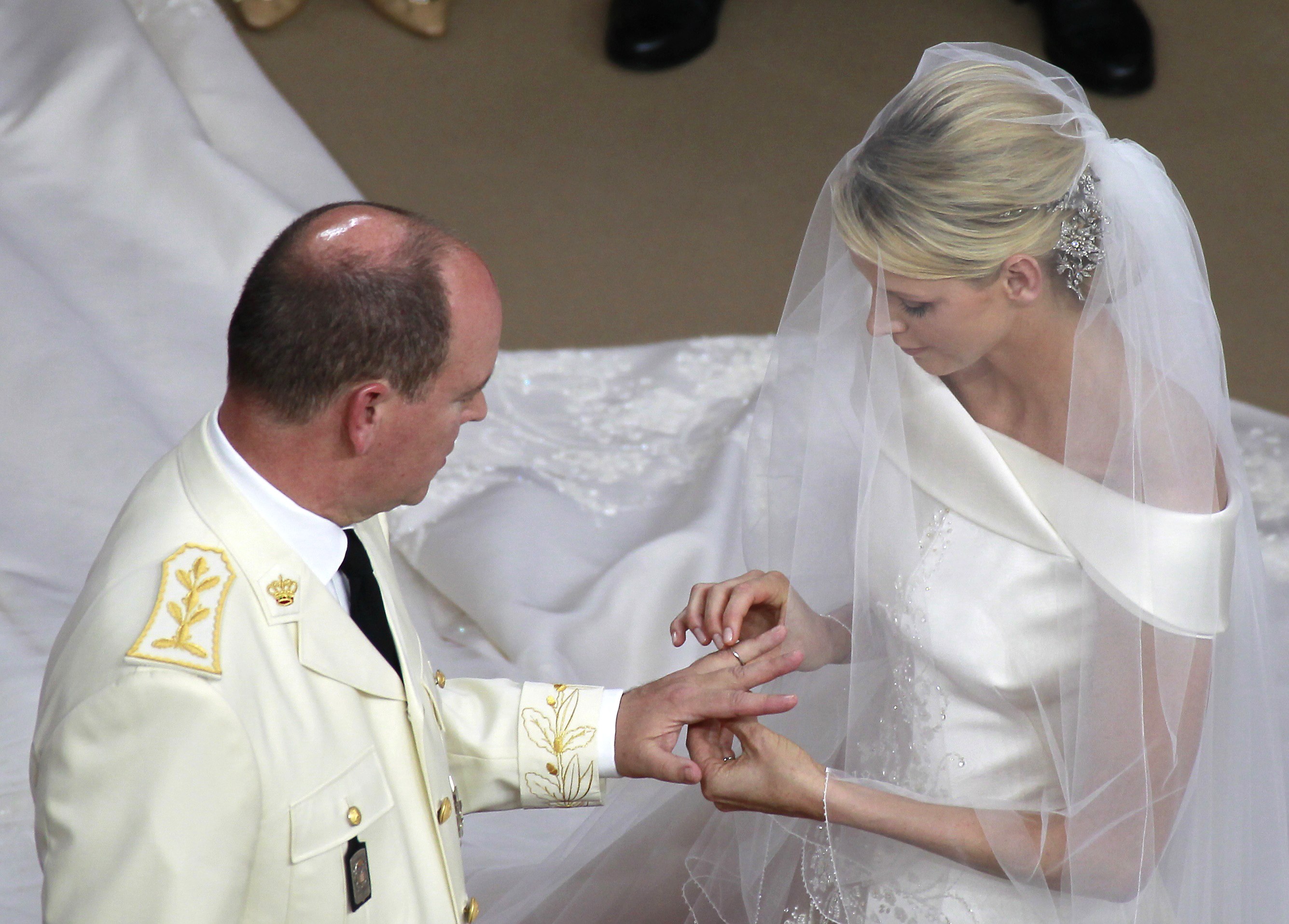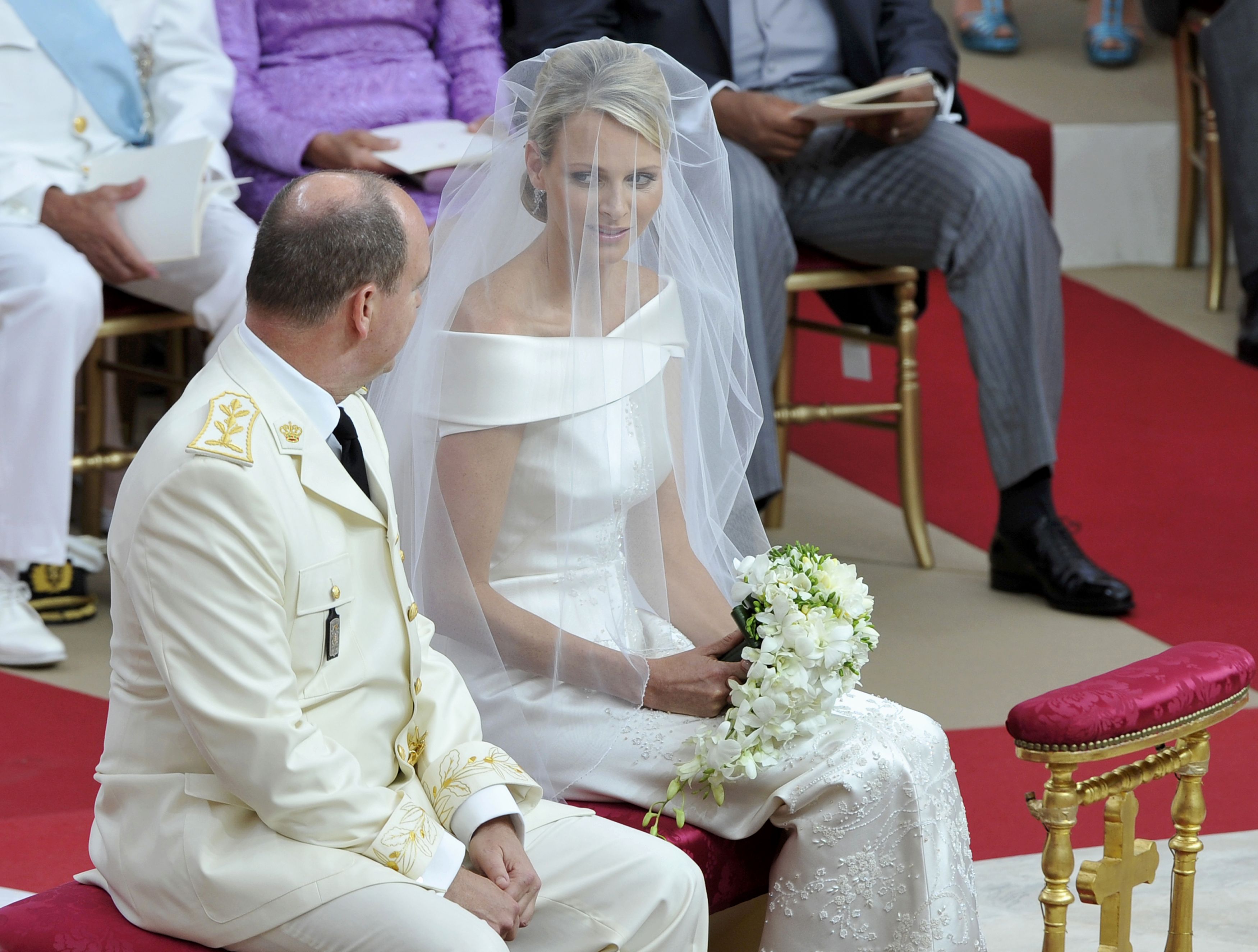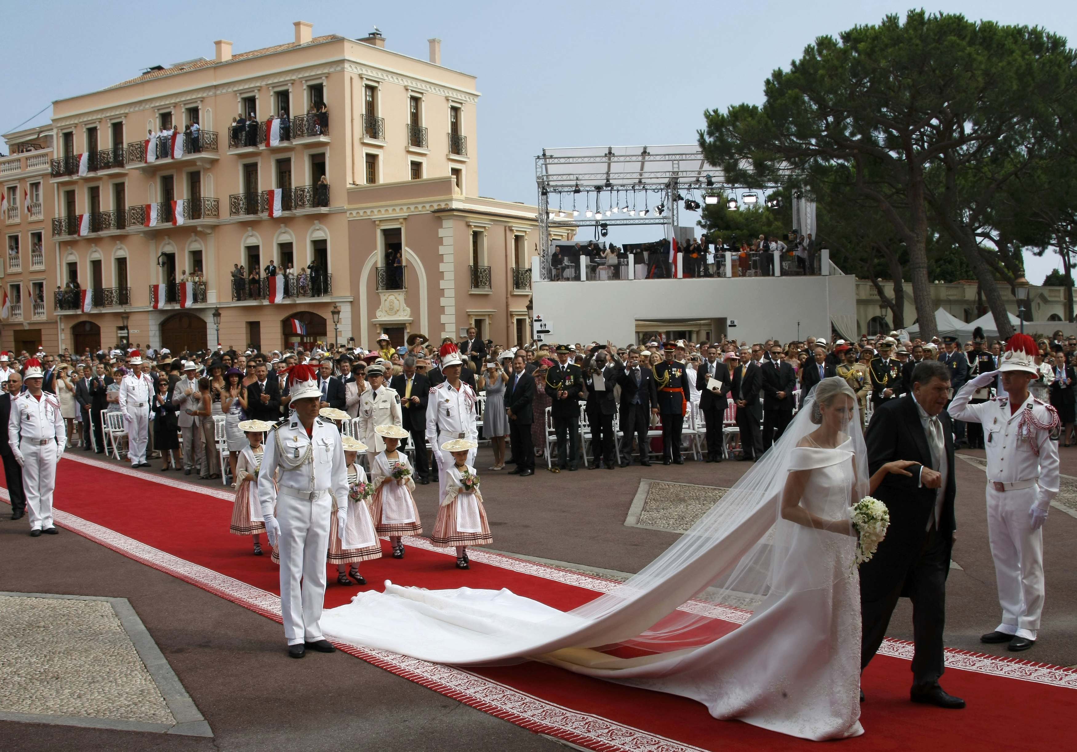 Φορώντας ένα ιβουάρ νυφικό με κεντημένα λουλούδια η 33χρονη Σαρλίν έφτασε στο παλάτι συνοδευόμενη από τον πατέρα της. Η πριγκίπισσα Σαρλίν διέσχισε όλη την πλατεία του ανακτόρου υπό τα βλέμματα των χιλιάδων Μονεγάσκων που είχαν προσκληθεί να παρακολουθήσουν την τελετή από γιγαντοοθόνες και την χειροκροτούσαν θερμά. Στο παλάτι περίμενε τη Νοτιοαφρικανή πριγκίπισσα χαμογελαστός και χαλαρός ο 53χρονος πρίγκιπας.