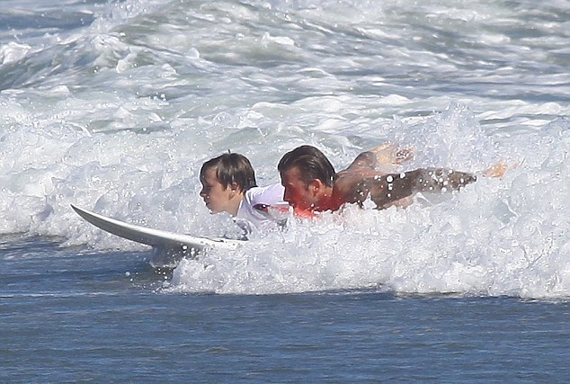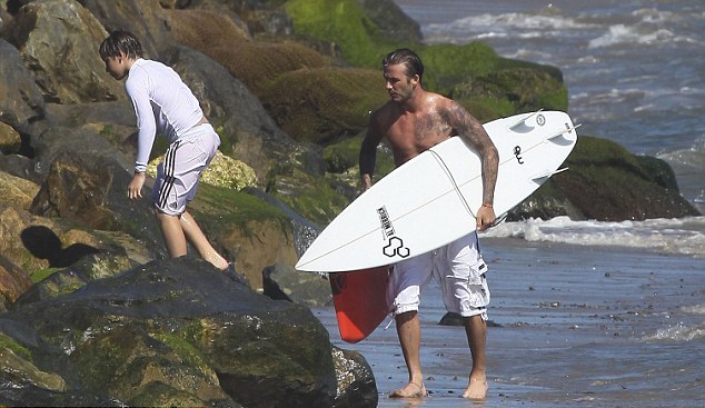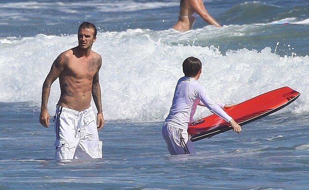 Ο άσος του ποδοσφαίρου πήρε το 12χρονο γιο του Brooklyn για μερικές βουτιές και παιχνίδι με τα κύματα σε παραλία του Μαλιμπού, την ώρα που η Victoria ήταν σπίτι με τη νεογέννητη κορούλα τους!
