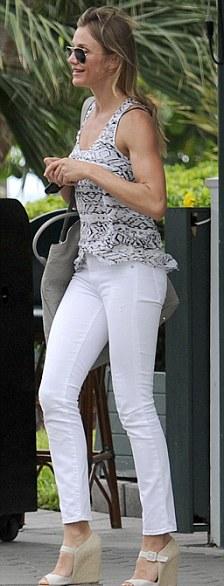 Η Cameron Diaz, έλαμπε μέσα στο άσπρο παντελόνι που αναδείκνυε τις τέλειες αναλογίες της και φορώντας ψηλοτάκουνες πλατφόρμες συγκέντρωνε όλα τα βλέμματα. Στο ίδιο στιλιστικό «μοτίβο» κινήθηκε και ο σύντροφός της που φόρεσε ένα άσπρο μπλουζάκι πόλο και βερμούδα.