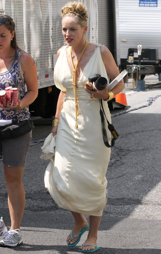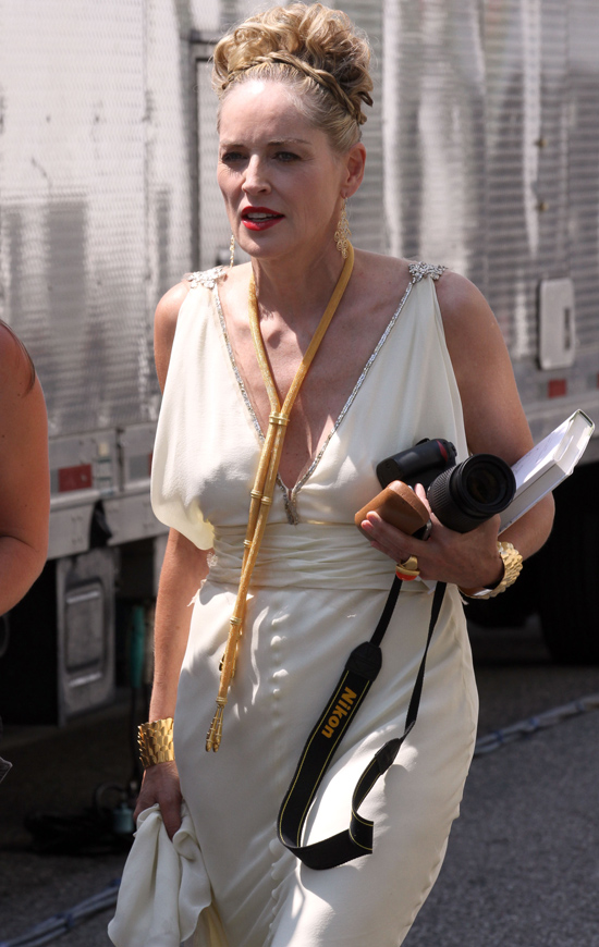 Με τα μαλλιά μαζεμένα ψηλά, ένα φλογερό κόκκινο κραγιόν στα χείλη και ένα ριχτό φόρεμα η Sharon Stone κυκλοφορούσε στους δρόμους της Νέας Υόρκης υποδυόμενη την Αφροδίτη για τη νέα της ταινίας, με τίτλο «Gods Behaving Badly».