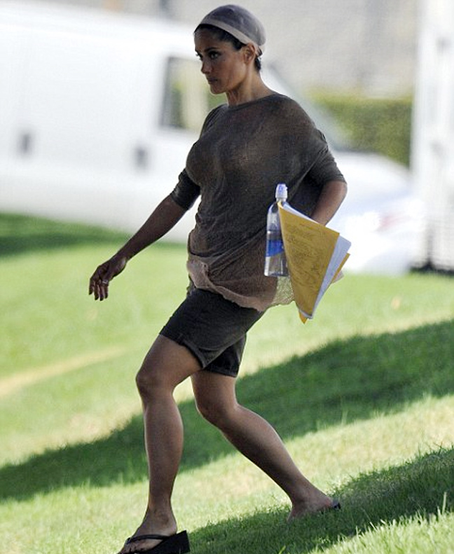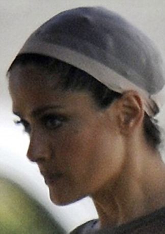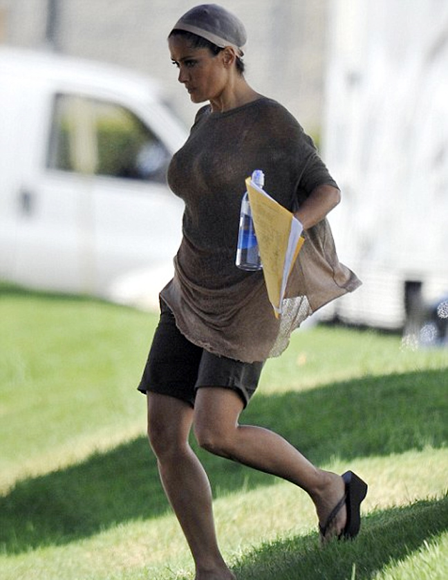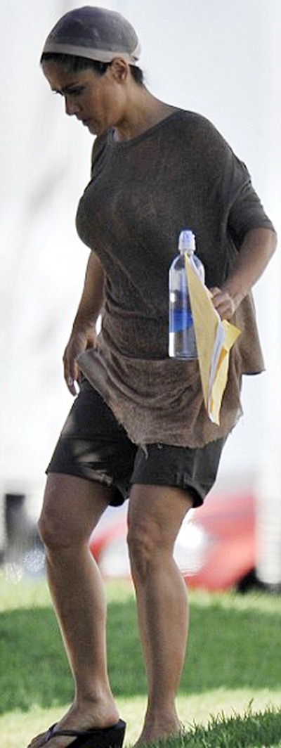 Η Salma Hayek, φορούσε ένα κάλυμμα περούκας στο κεφάλι της που δεν την κολάκευε. Το κάλυμμα κάλυπτε τα πλούσια και μακριά μαλλιά της. Επίσης, φορούσε μια φαρδιά μπλούζα και ένα σορτσάκι.