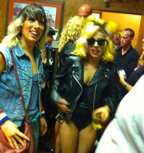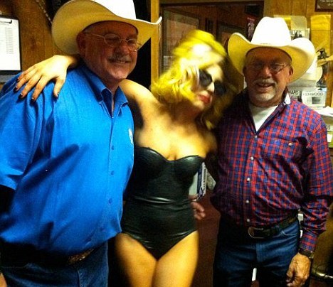 Η Lady Gaga με ένα kinky look -φορώντας ένα βινύλ κορμάκι κι ένα μπουφάν τύπου perfecto (το οποίο στην πορεία το έβγαλε)- πήγε στο σαλούν στο Ντάλας και φωτογραφήθηκε με τους all time classic καουμπόηδες που συχνάζουν εκεί.