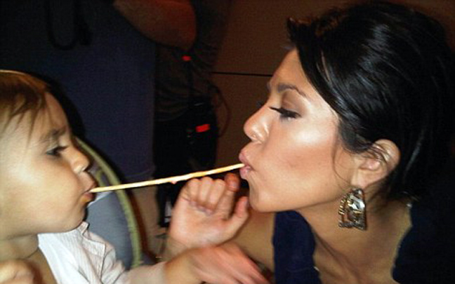 Αν και θα σας φανεί περίεργο η σκηνή εκτυλίχθηκε σε γνωστό εστιατόριο της Νέας Υόρκης. Η 32χρόνη αδερφή της εκρηκτικής Kim Kardashian, Kourtney , η οποία αυτή την περίοδο βρίσκεται στην Νέα Υόρκη για τα γυρίσματα ριάλιτι στο οποίο πρωταγωνιστεί η ίδια και η αδερφή της, αποφάσισε να αναπαραστήσει μια σκηνή από το κλασικό παιδικό της Disney «Η λαίδη και ο αλήτης» ενώ έτρωγε με το γιό της.