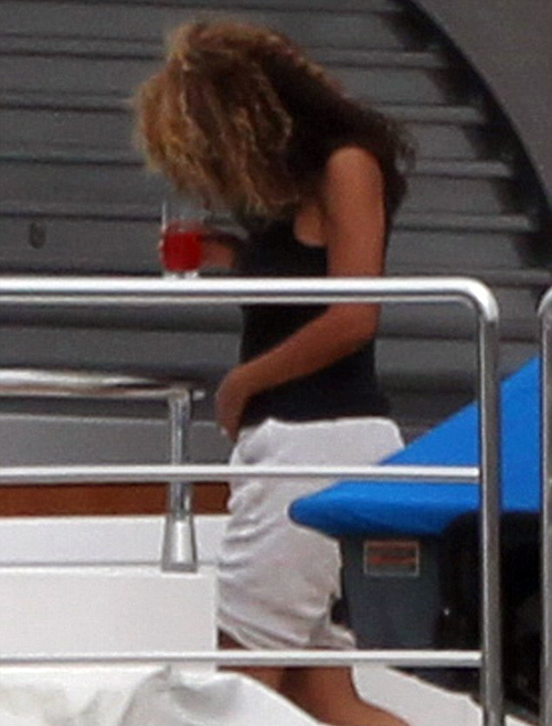 Υπό το βλέμμα του «άγρυπνου» σωματοφύλακά της η τραγουδίστρια που πιθανότατα είναι πέντε μηνών επιβιβάστηκε σε ένα μικρό σκάφος μαζί με τον σύντροφό της και κατευθύνθηκαν στο γιότ που τους περίμενε όπου και έμειναν.