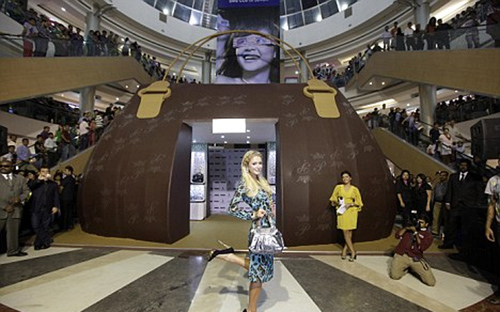 Η Paris πόζαρε χαριτωμένα στο φακό φορώντας τις τσάντες που σχεδίασε, για να παρουσιάσει τη νέα της κολεξιόν και μοίρασε αυτόγραφα σε μικρές θαυμάστριες της.