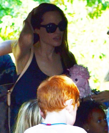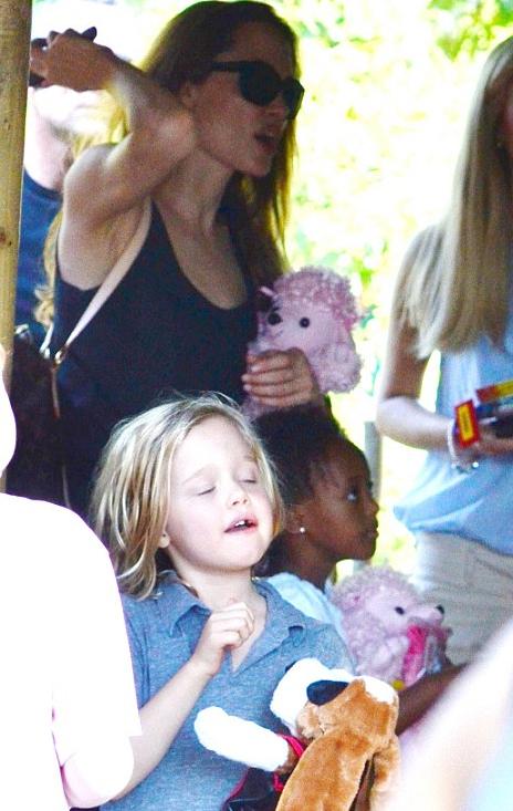Ο φακός την απαθανάτισε να μοιράζει το χρόνο της ανάμεσα στα παιδιά της και στο να μιλάει στο κινητό της τηλέφωνο. Ίσως στην άλλη άκρη της γραμμής να ήταν ο Brad Pitt o οποίος τελευταία αφιερώνει ελάχιστο χρόνο στην οικογένεια του, λόγω των γυρισμάτων της νέας του ταινίας.
