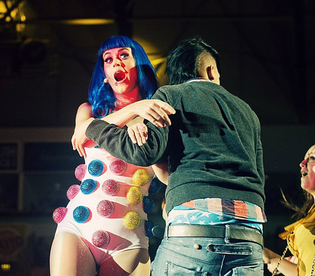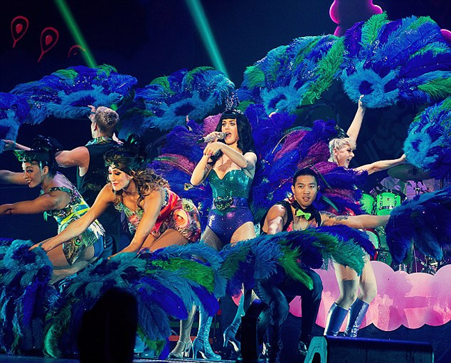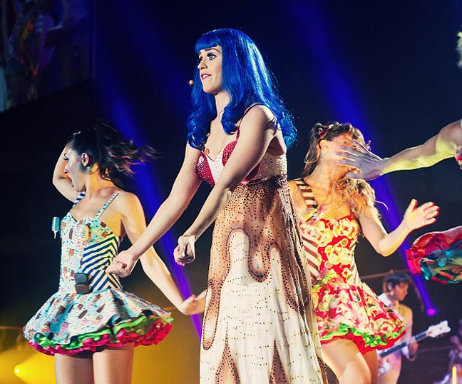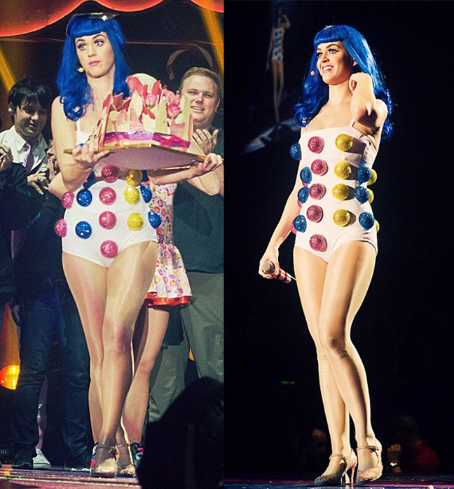 Η τραγουδίστρια είναι γνωστή για τα πολύχρωμα κοστούμια της αλλά το έχει παρακάνει. Η Perry φόρεσε ένα κορμάκι εμπνευσμένο μάλλον από χριστουγεννιάτικο δέντρο. Στο κεφάλι της δε δέσποζε μια μπλε περούκα που συμπλήρωσε την κιτς εμφάνιση της επί σκηνής. Η 27χρονη δεν αρκέστηκε σε ένα μόνο «ρούχο» αλλά έκανε και άλλες τέτοιες εμφανίσεις.