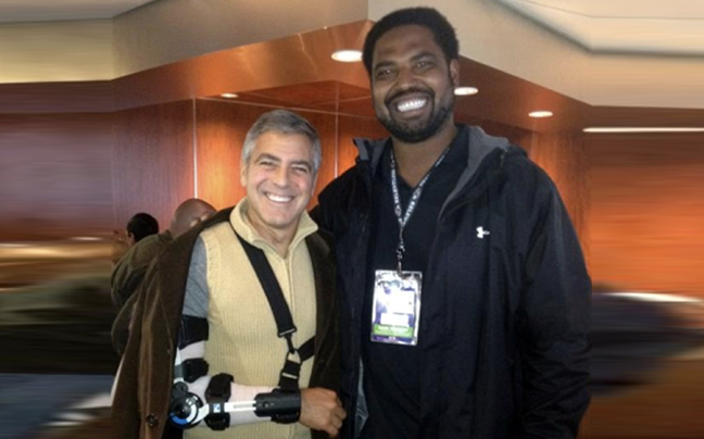 Το χέρι του το στήριζε ένα σίδερο αλλά ο Clooney ήταν χαμογελαστός και ευδιάθετος.