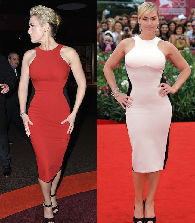 Η Kate Winslet έκλεψε τις εντυπώσεις φορώντας το ίδιο φόρεμα αλλά σε κόκκινο με το οποίο είχε εμφανιστεί τον Σεπτέμβρη σε εκδήλωση. Φαίνεται αγαπάει το συγκεκριμένο στυλ φορέματος το οποίο λειτουργεί ως οφθαλμαπάτη. Το φόρεμα αυτό με την μαύρη γραμμή στο πλάι της σχεδιάστριας Stella Mc Cartney καταφέρνει να τονίσει τις καμπύλες και να κρύψει τις ατέλειες.