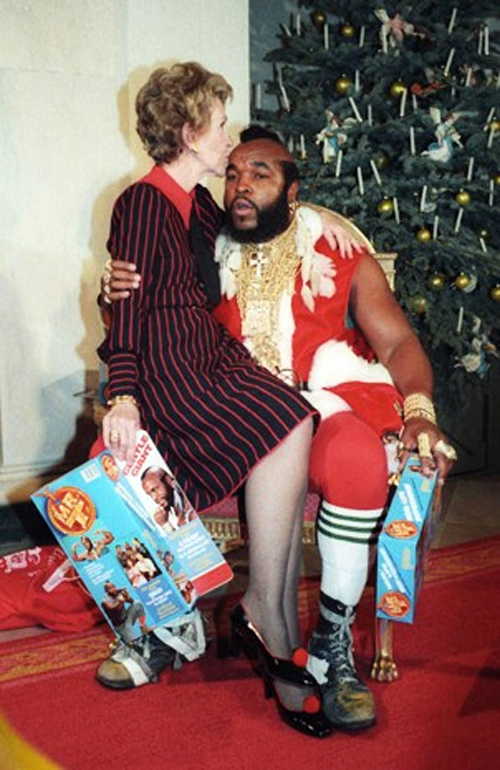 Μία από τις πιο ενδιαφέρουσες φωτογραφίες της δεκαετίας του 80. Η πρώην πρώτη κυρία των ΗΠΑ, Nancy Reagan, κάθεται στα πόδια του Mr. T από την σειρά The A -Team, ο οποίος έχει ντυθεί Άγιος Βασίλης, μπροστά από το χριστουγεννιάτικο δέντρο του Λευκού Οίκου.