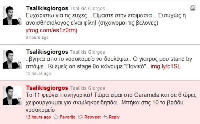 Ο Γιώργος, αντιμετωπίζει την κατάσταση με χιούμορ και μάλιστα ανάρτησε μια φωτογραφία στο twitter του με τον ορό στο χέρι. Μάλιστα, ο γιατρός του βρίσκεται κοντά του σε περίπτωση που χρειαστεί κάτι, ενώ το πρωί θα πάει στο νοσοκομείο για την αφαίρεση της σκωληκοειδίτιδας.