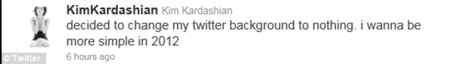 Την επιθυμία της να είναι πιο απλή το 2012 εξέφρασε η Kim Kardashian και είπε να κάνει την αρχή αλλάζοντας το φόντο που έχει στον λογαριασμό της στο Twitter. Αντικατέστησε λοιπόν το κολάζ με φωτογραφίες της που είχε με ένα σκέτο μαύρο φόντο και αναρτώντας το μήνυμα περί απλότητας.