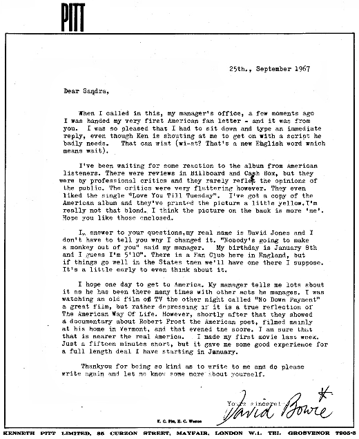 Το 1967, λοιπόν, ο Bowie, γεμάτος χαρά, κάθισε στη γραφομηχανή και απάντησε – ο ίδιος – στο γράμμα της 14χρονης Σάντρα Ντοντ από το Νέο Μεξικό, η οποία του είχε πει ότι η μουσική του ήταν εξίσου καλή με αυτή των Beatles, ενώ τον ρωτούσε ποιο ήταν το πραγματικό του όνομα και γιατί το είχε αλλάξει!