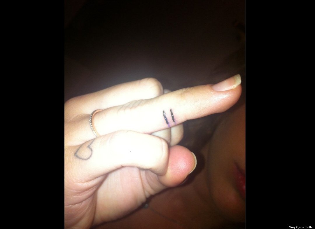 Η Miley Cyrus πρόσθεσε πρόσφατα ένα νέο τατουάζ στην «πλούσια» συλλογή της: το σύμβολο του «ίσον» στο μεσαίο της δάκτυλο! Μπορεί να φαντάζει προσβλητικό, στην πραγματικότητα, όμως, το τατουάζ εκφράζει την υποστήριξη της Miley προς το γάμο των ομοφυλοφίλων.