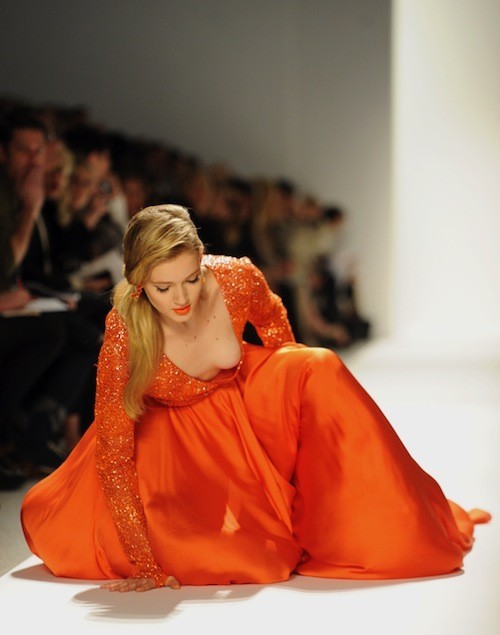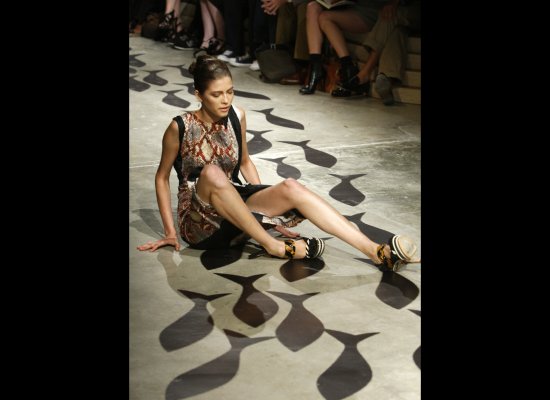 Τελευταίο «θύμα» της πασαρέλας, ήταν ένα μοντέλο της επίδειξης του Dennis Basso, στη Νέα Υόρκη. Η κοπέλα έχασε την ισορροπία της και έπεσε, αλλά, ούτε γάτα ούτε ζημιά: σηκώθηκε και συνέχισε, σαν να μην είχε συμβεί τίποτα!