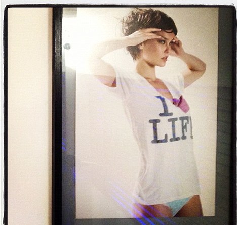 Στη φωτογραφία φοράει ένα T-shirt που γράφει επάνω «Αγαπώ τη ζωή» ενώ από κάτω αρκέστηκε σε ένα θαλασσί εσώρουχο.