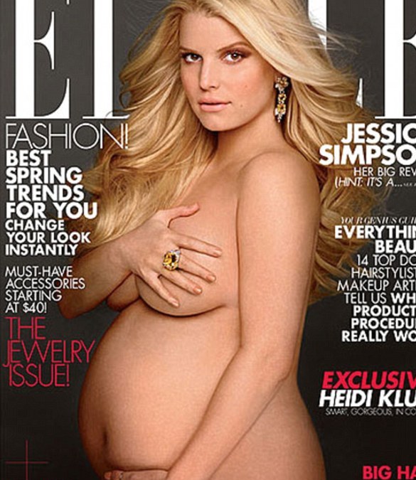 Η Jessica Simpson ανήκει στην λίστα αυτή καθώς ποζάρει γυμνή, αναδεικνύοντας την κοιλιά της για το περιοδικό «Elle». Η 31χρονη κρατάει με το ένα χέρι την κοιλιά της και με το άλλο καλύπτει τα επίμαχα σημεία της.