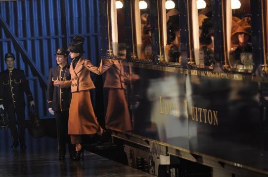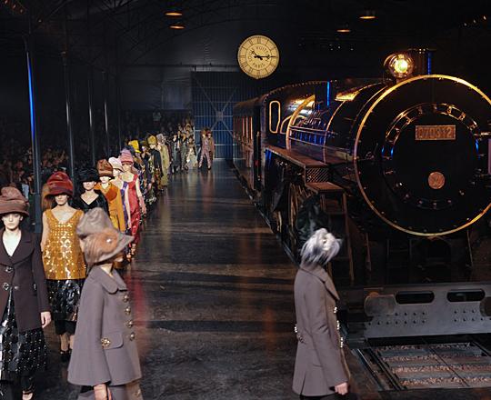 Μόλις φτάνει στο σταθμό το τρένο με τις δημιουργίες του οίκου Louis Vuitton για το φθινόπωρο του 2012. Αυτό κατά πάσα πιθανότητα θα ακουγόταν από τα μεγάφωνα αν βρισκόμασταν σε μια κανονική αποβάθρα.