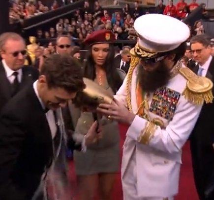 Ο Sacha Baron Cohen εμφανίστηκε στα Oscar με στολή από την καινούρια του ταινία «The Dictator». Ο ηθοποιός έριξε ψεύτικες στάχτες πάνω στον παρουσιαστή Ryan Seacrest κατά την διάρκεια συνέντευξης στο κόκκινο χαλί.